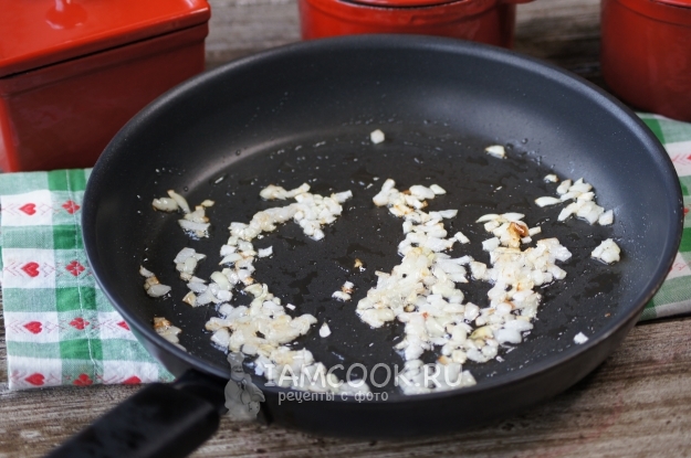 Для начала очистим репчатый лук, мелко нарежем и обжарим на сковороде с растительным маслом до румяности.