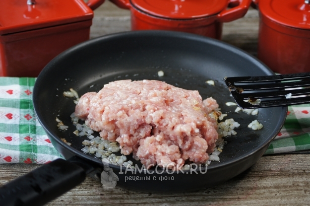 Выложим фарш и обжарим до полуготовности, посолим, поперчим.