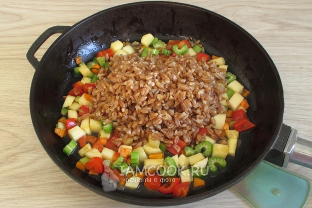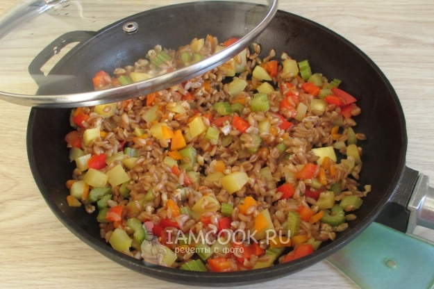 Обжарьте овощи при помешивании 10-15 минут на сильном огне, а потом добавьте готовую полбу.