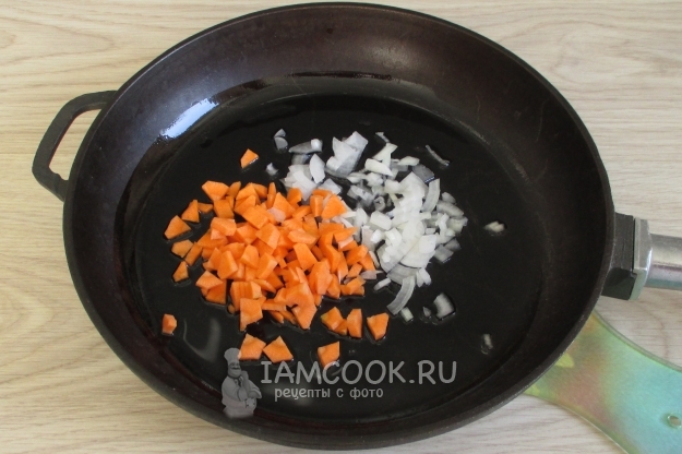 Пока варится полба, займитесь овощами. Половинку средней луковицы и одну небольшую морковку мелко нарежьте, положите на сковороду и потомите на среднем огне минут 10, слегка посолите.