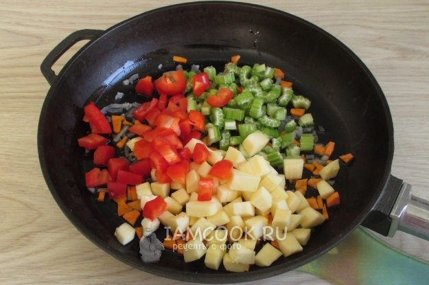Добавьте кабачок и сладкий перец, нарезанные средним кубиком и по желанию ещё нашинкованный стебель сельдерея (он - на любителя...)