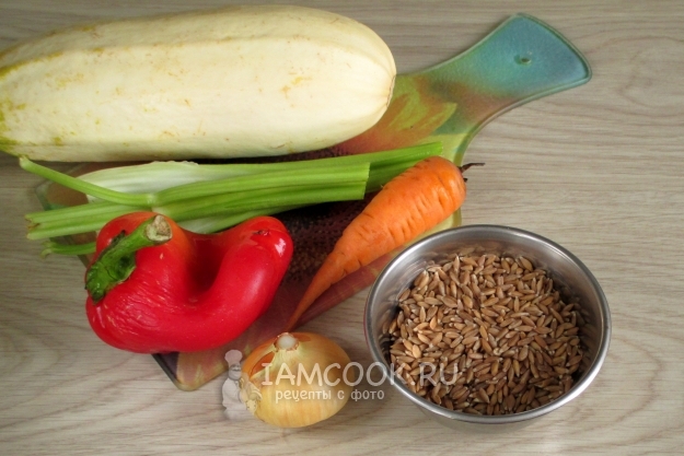 Для приготовления полбы с овощами подготовьте ингредиенты по списку к рецепту.