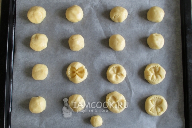 Для формовки печенья лучше всего просто отщипывать кусочки теста, из которых формировать шарики. Круглые заготовки уложите на смазанный противень или пекарскую бумагу. Слегка приплюсните их руками, вилкой или, как у меня, макаронным бантиком.