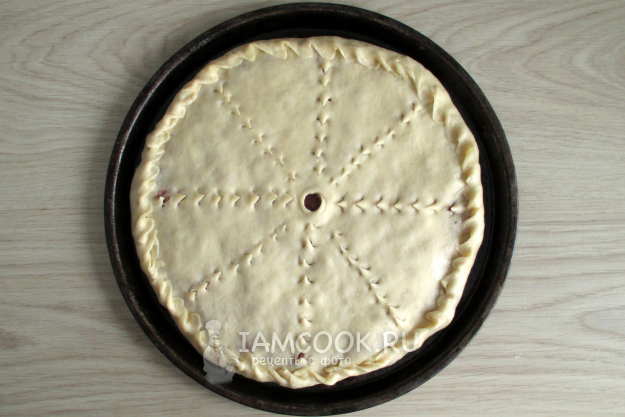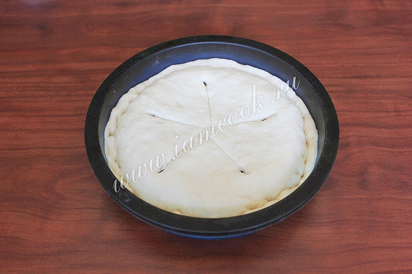 Укройте начинку лепешкой из второго куска теста и защипайте края. Сделайте отверстие для выхода пара и, если есть желание, то какой-нибудь рисунок, например, просто ножницами.