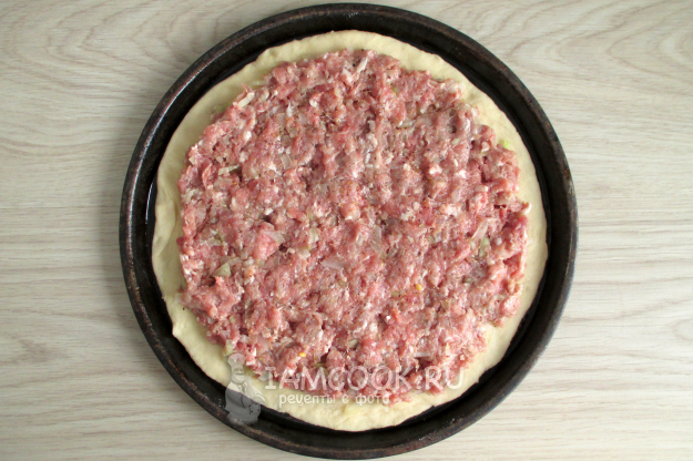 Распределите ровным слоем мясную начинку, оставив немного теста для защипа.