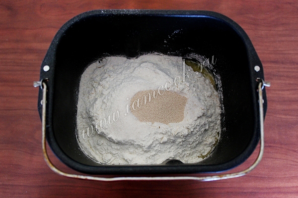 Добавьте муку с сахаром, солью и дрожжами.