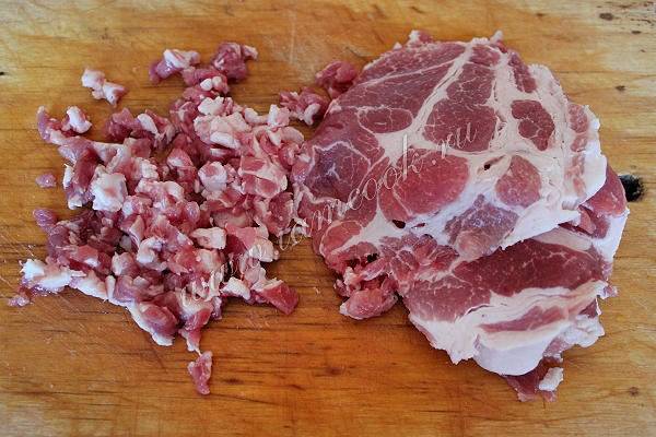 Пока тесто поднимается, займитесь начинкой. Мелко порубите мясо вручную или при помощи мясорубки с крупноячеистой насадкой.