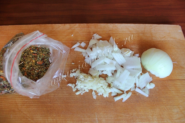 Нашинкуйте лук и измельчите чеснок. Подберите на свой вкус состав острых перцев и ароматных трав. Перемешайте мясо, лук и специи, посолите. Вымесите тесто до состояния похожего на вязкое.