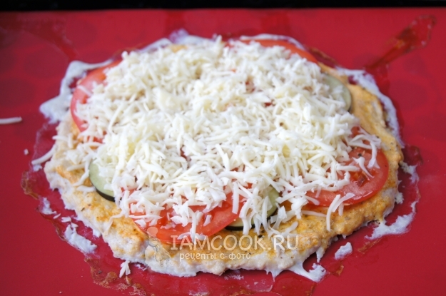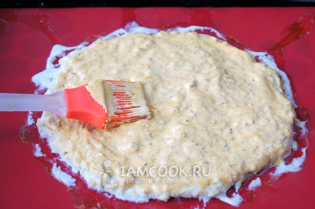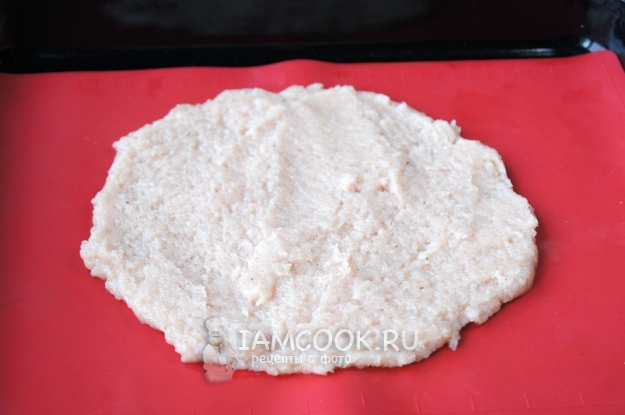 Противень застелите пекарской бумагой или силиконовым ковриком, выложите куриную массу, разровняйте и придайте форму круга, поставьте в разогретую до 200 градусов духовку на 10-15 минут.