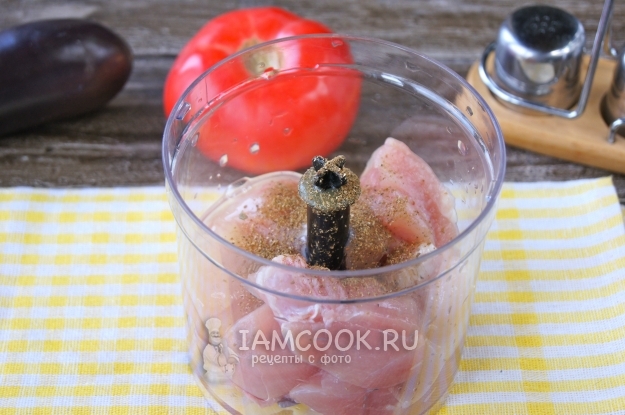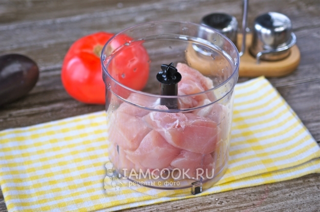 Для начала вымойте и обсушите куриную грудку, нарежьте на куски и выложите в чашу блендера.