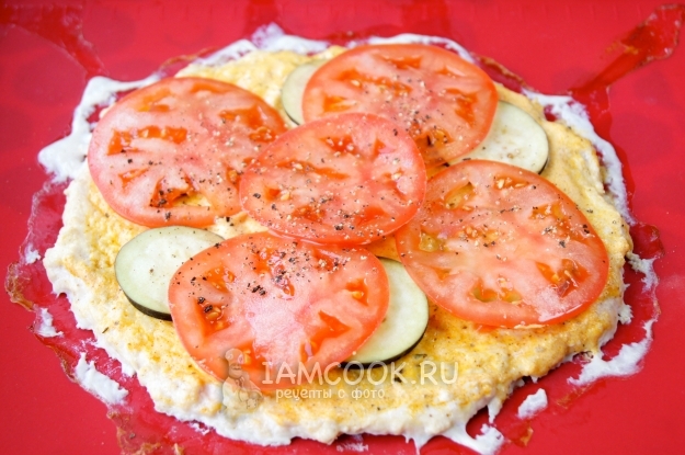 Нарежьте баклажан и помидор на кружочки и выложите сверху.