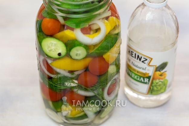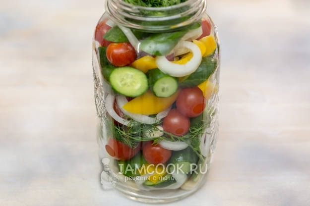 Выложите нарезанные овощи в банку слоями, например: лук, чеснок, перец, огурцы, помидоры, укроп (резать не надо).