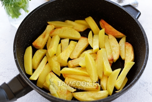 В небольшом количестве постного рафинированного масла обжарьте нарезанный ломтиками картофель минут 10.