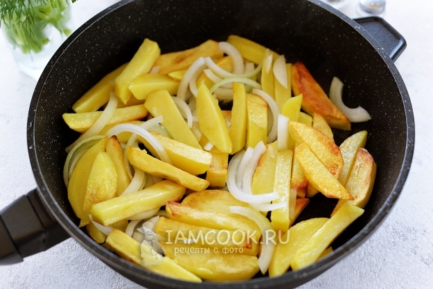 Лук нарежьте полукольцами, всыпьте в сковороду, сделайте тише огонь, готовьте еще минут 5. Картофель за это время практически будет готов.