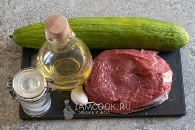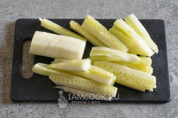 Огурец режем кусочками примерно с теми же габаритами, что и говядину. Можно почистить, можно не чистить - зависит от толщины шкуры и её степени подпорченности.