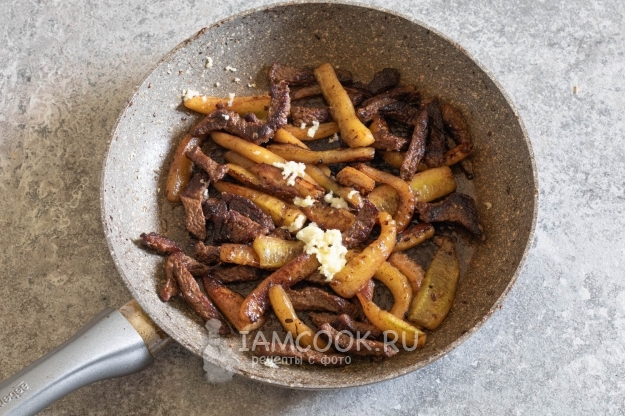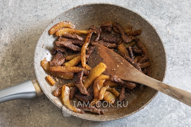 К зарумянившемуся мясу добавляем огурец и вторую ложку растительного масла, обжариваем их вместе, потом закрываем крышку, убавляем огонь и тушим огурцы с говядиной до мягкости мяса. Тут всё полностью зависит от того, из какого отруба был кусок. Но что важно - пересушенным мясо не получится, огурцы не дадут, они там будут рядышком.