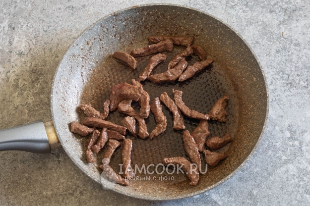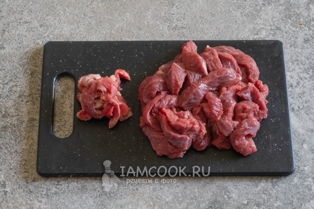 Говядину режем полосками. Если есть плёнки - удаляем.
