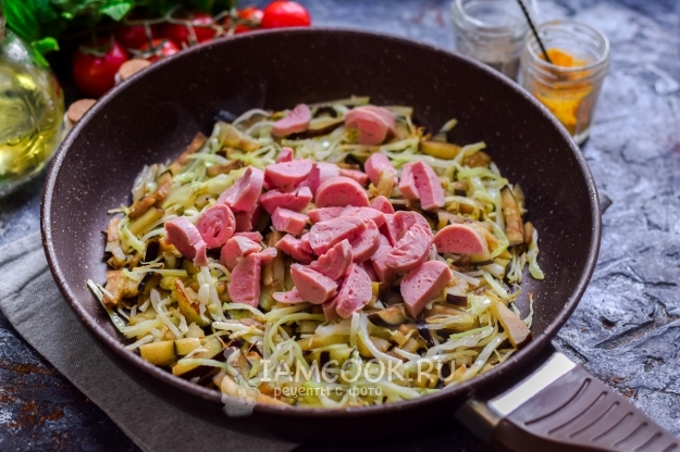 Сосиски очистить от пленки, нарезать небольшими кусочками и добавить в сковороду. Влить в сковороду немного воды, тушить капусту 15 минут.