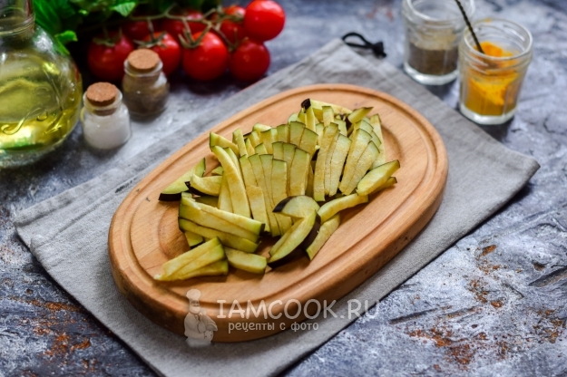 Баклажан сполоснуть и просушить, нарезать полосками.