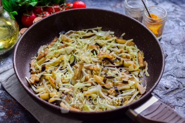 В сковороду влить немного растительного масла, переложить капусту и баклажаны – жарить 8-10 минут, периодически помешивая.