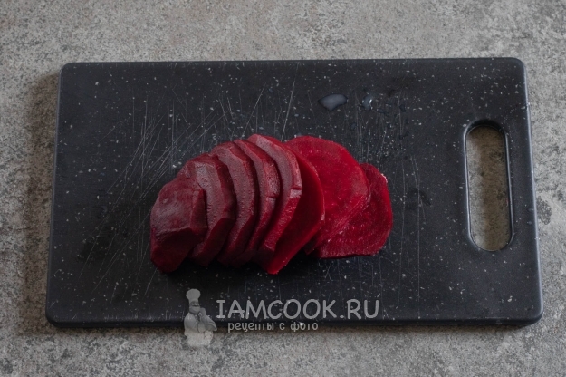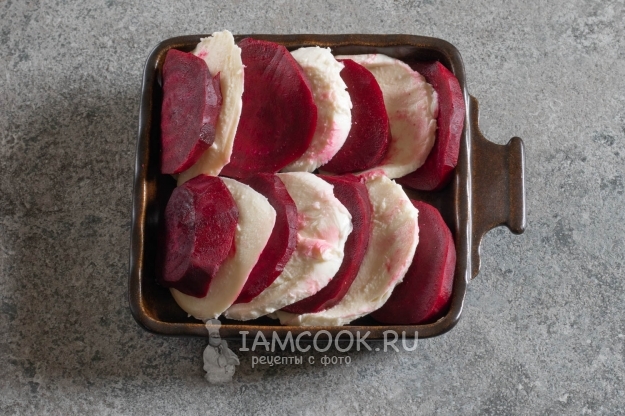 Укладываем сыр со свёклой в форму, чередуя их куски. Можно слегка посолить.