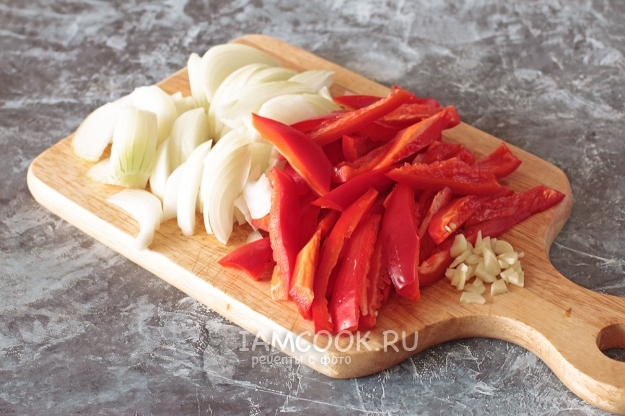 Репчатый лук нарежьте перьями, болгарский перец - соломкой, чеснок порубите произвольно.