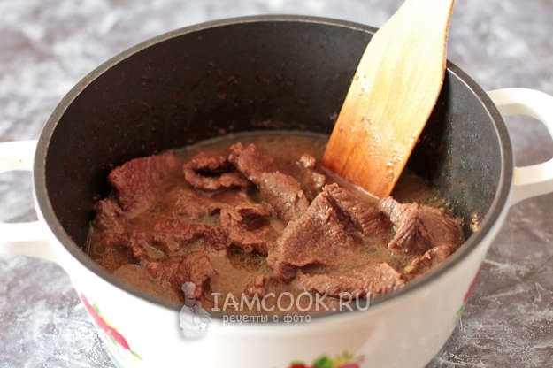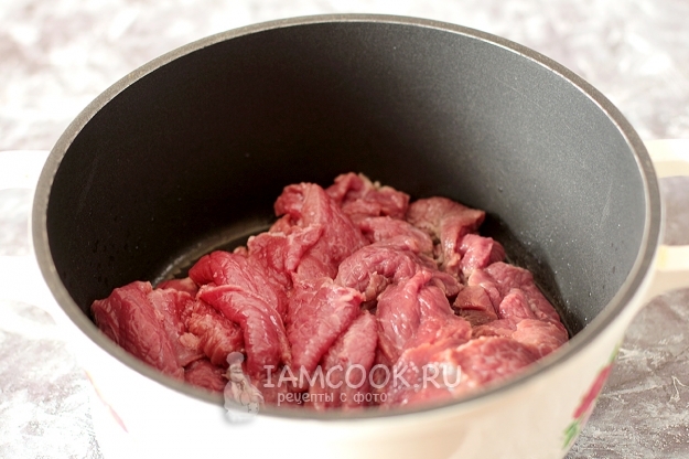 Телятину нарежьте поперек волокон тонкими пластинками. Обжарьте ее в хорошо разогретом растительном масле в казане.