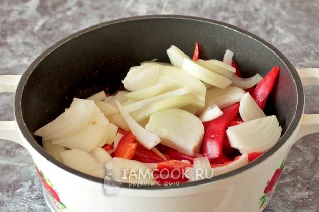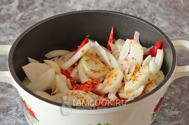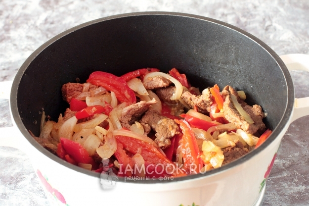 Добавьте специи и тушите все вместе под крышкой до мягкости лука и перца. Не забывайте перемешивать мясо с овощами, чтобы не подгорело. Овощи должны дать сок и мясо будет в нем томиться.
