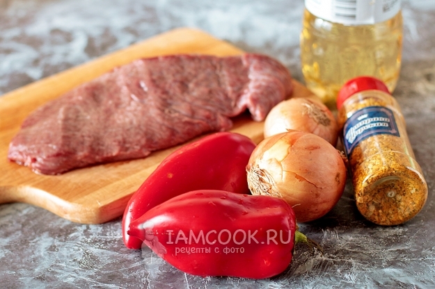 Подготовьте необходимые продукты для приготовления телятины в казане с болгарским перцем и луком.