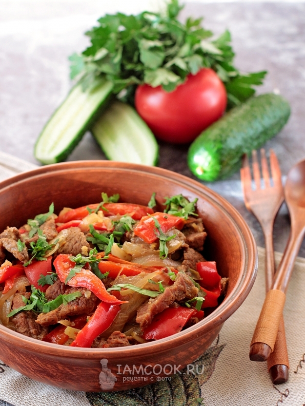 Телятина в казане с болгарским перцем и луком готова. К блюду подойдет любой гарнир, на ваше усмотрение. Приятного!