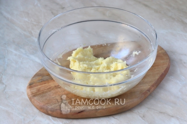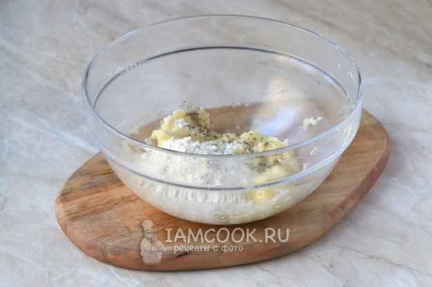 Картофельную кашицу посолить, добавить чёрный молотый перец и пшеничную муку.