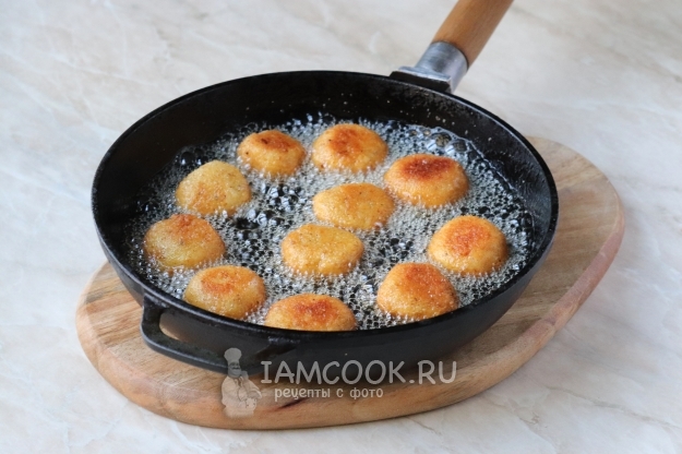 Во фритюре или небольшой сковороде разогреть достаточное количество растительного масла и опустить заготовки. Лучше всего жарить небольшими порциями на умеренном огне, чтобы они успели приготовиться не только снаружи, но и внутри.