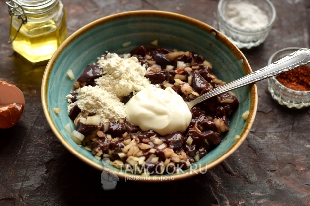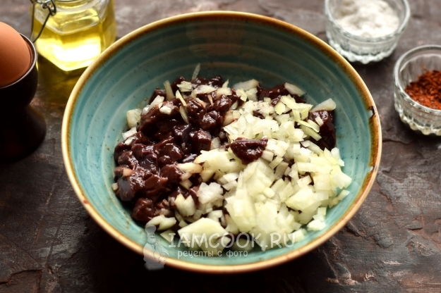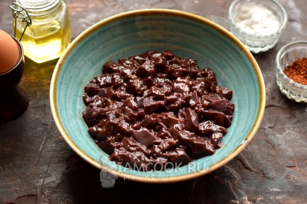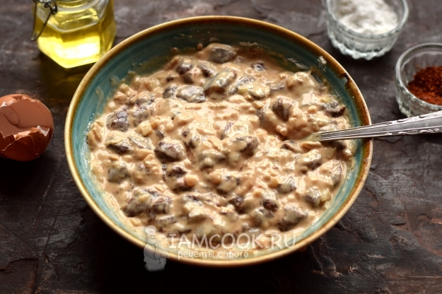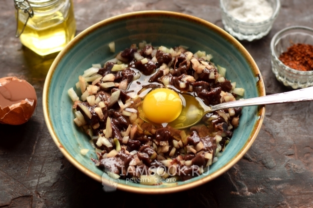 Вбейте одно яйцо, перемешиванием соедините его с кусочками печени.