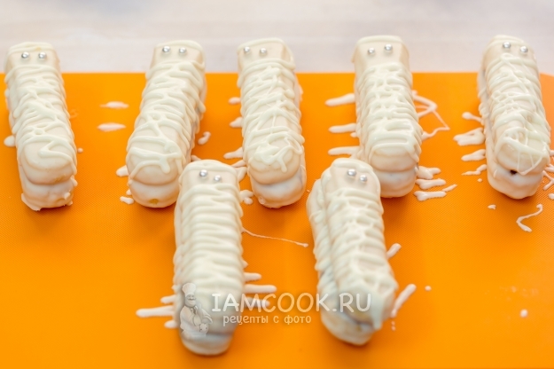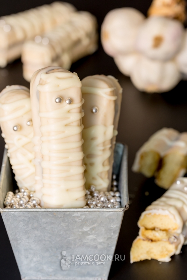 Получатся вот такие совсем не страшные, а очень даже очаровательные мумии из печенья Савоярди на Хэллоуин.