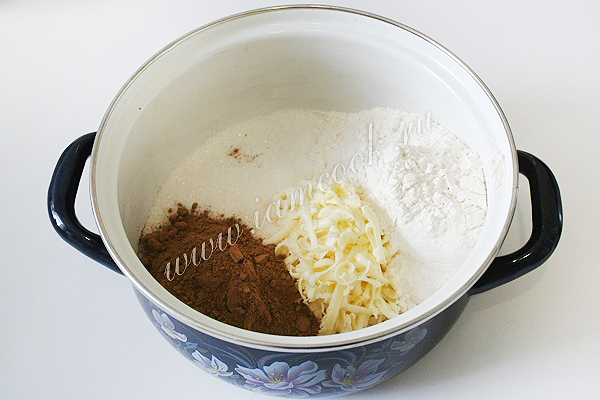 Для приготовления песочного теста смешайте в кастрюле муку, сахар, какао и натертое на терке сливочное масло. Масло перед тем как натирать желательно на несколько часов положить в морозильник и слегка заморозить. Руками разотрите всё в крошку.