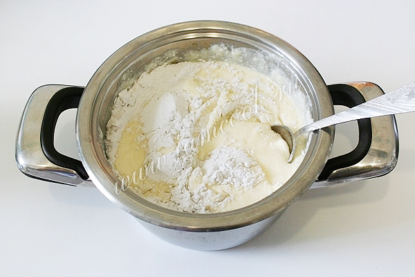 Приготовьте творожную начинку. Творог, сметану, сахар и яйца положите в глубокую миску или кастрюлю и взбейте блендером.