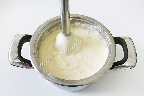 Добавьте ванилин и крахмал и размешайте ложкой или еще немного взбейте блендером.