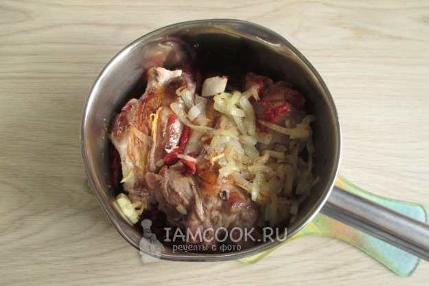 Этим соусом нужно залить мясо для тушения. В зависимости от его количества вылейте соус в сковороду или переложите (как у меня) куски мяса в подходящий по размеру сотейник (или кастрюлю, или чашу мультиварки).