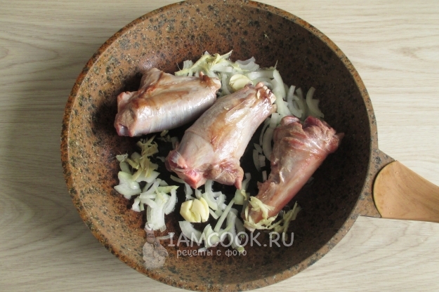 Затем добавляем на сковороду к мясу нашинкованный лук, раздавленные зубчики чеснока и крупно тертый корень имбиря. Обжарьте все вместе ещё минут пять.