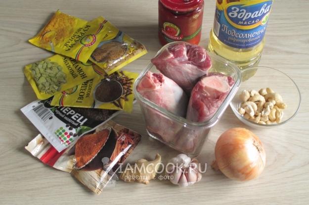 Для приготовления баранины, тушенной в пряном томатном соусе, подготовьте ингредиенты по списку к рецепту.