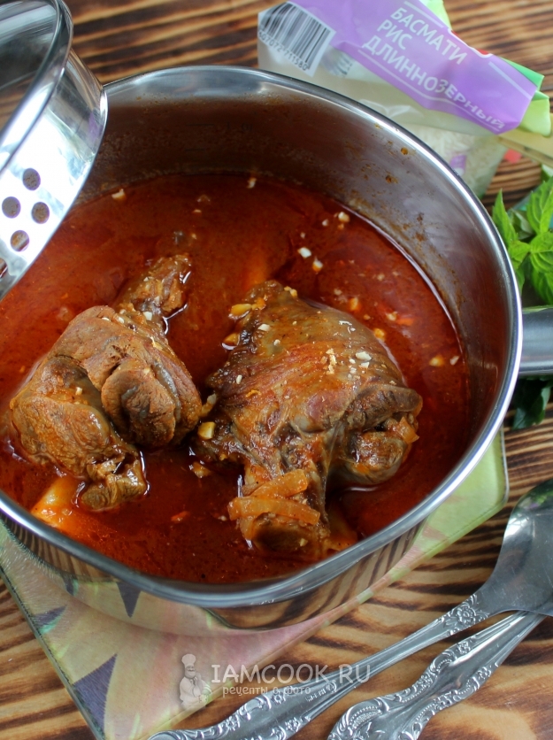 У меня были бараньи голяшки, а подходит и мясо с других частей. Голяшки вполне удобно готовить и целиком, с кости ещё будет дополнительный вывар при тушении, он для соуса - в тему.
