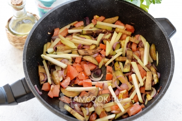 Когда выкипит вода, положите к овощам нарезанный кубиком помидор, тушите минут 5. При необходимости подлейте еще немного воды.