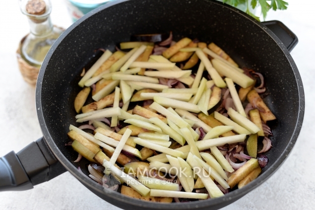 Если любите картошку, лучше её нарезать соломкой и добавить к луку после его обжарки. 35-40 минут - вполне достаточно, чтобы картофельная соломка дошла до готовности.