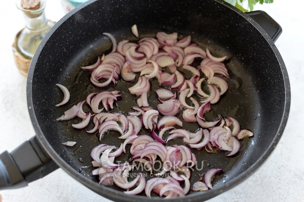 Лук мелко порежьте, обжарьте минуту-другую до мягкости.