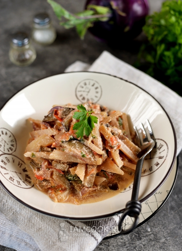 Разложите готовую тушеную кольраби с баклажанами в сметанном соусе по порциям и подавайте. Очень вкусно с картофельным пюре.