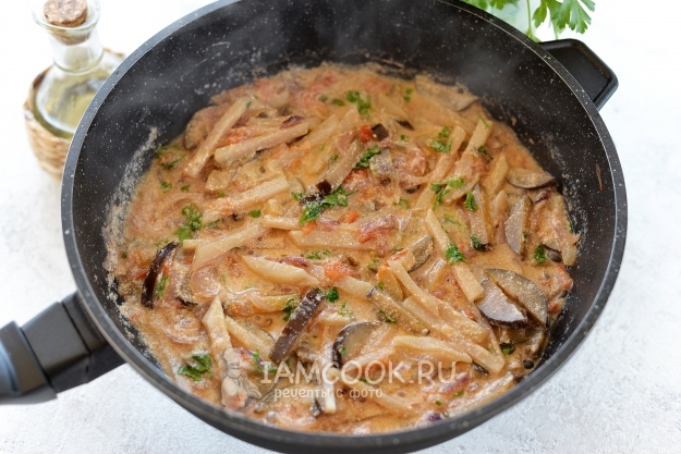 Теперь положите нежирную сметану, соль и перец по вкусу, при желании можно добавить раздавленный зубчик чеснока. Доведите до кипения, попробуйте на вкус: если получилось слишком кисло, можно подсыпать немного сахара. Выключите плиту, накройте сковороду крышкой и дайте блюду минут 10 постоять, чтобы все вкусы смешались.