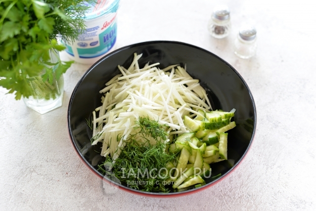 Кольраби обязательно очистите от кожуры, она жесткая и волокнистая. Нарежьте капусту тонкой соломкой или натрите на терке для корейской моркови. Укроп нарубите мелко, добавьте к огурцам с луком.