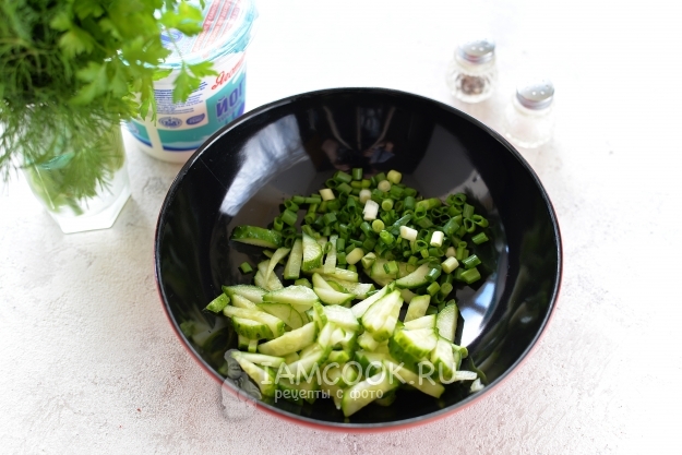 Удалите хвостик на огурце, нарежьте тонкой соломкой, зеленый лук мелко нарубите, сложите в глубокую миску.