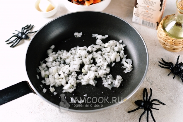 В небольшом количестве постного рафинированного масла обжарьте несколько минут нарезанный мелким кубиком репчатый лук.