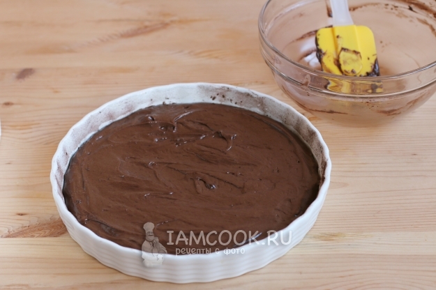 Форму для выпечки смажем немного сливочным маслом и присыплем смесью муки и какао. Выльем густое тесто в форму и разровняем поверхность.